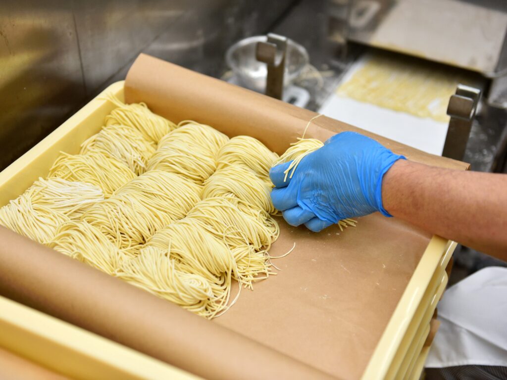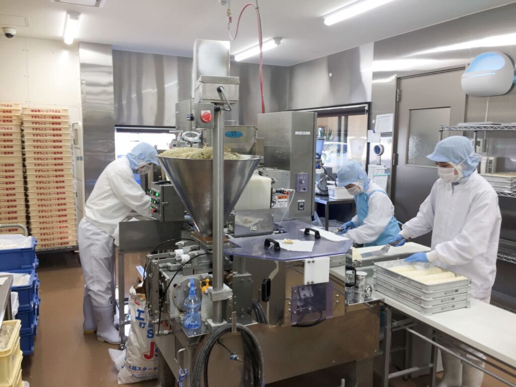 具体的には、工場内で野菜や肉の下処理、機械を使った餃子製造や製麺作業を